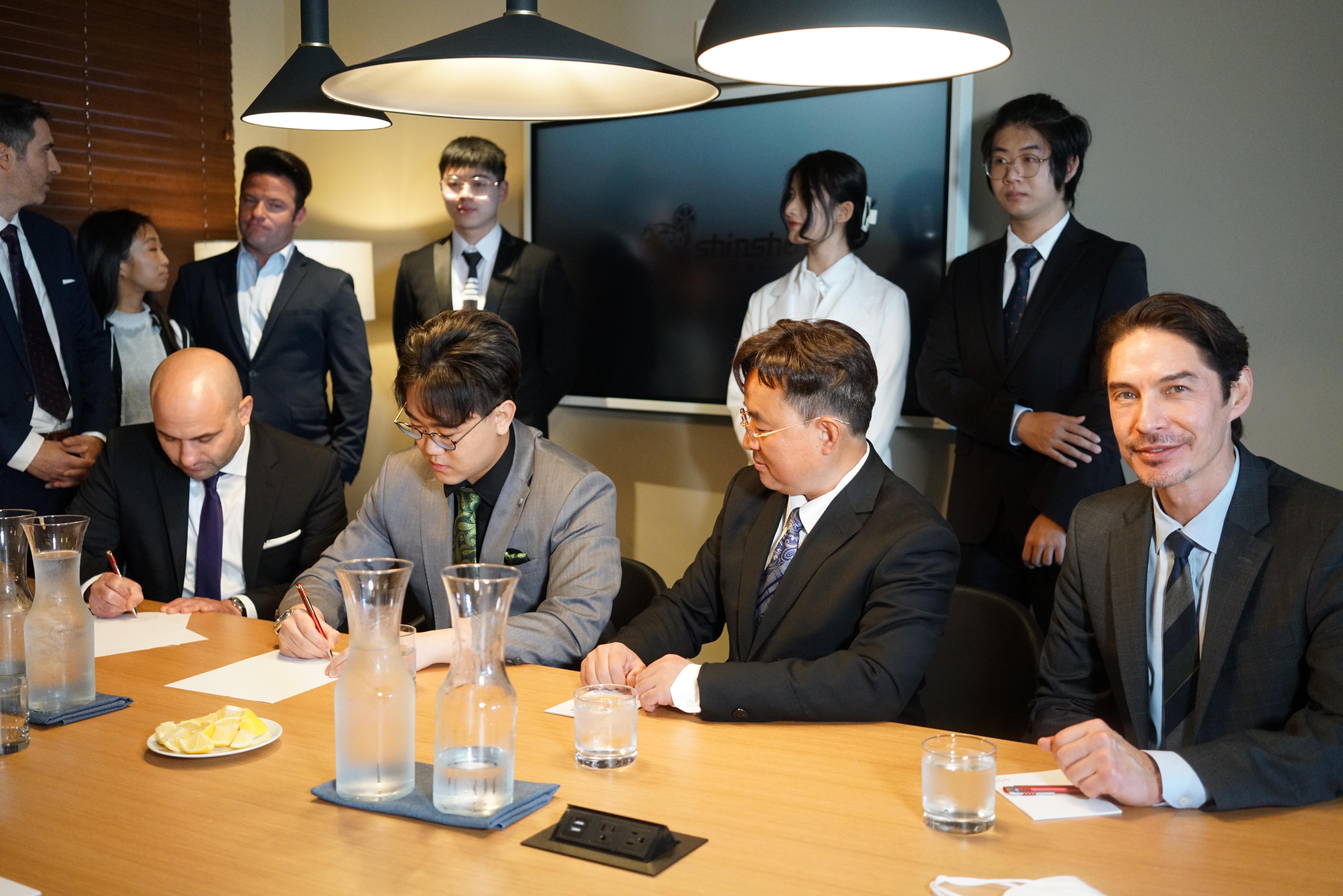 Jonas Hu(前排左二)签约投资独立影片Smile As You Kill,右一为著名影星Michael Teh,左一为该片制片人Michael Sarrow