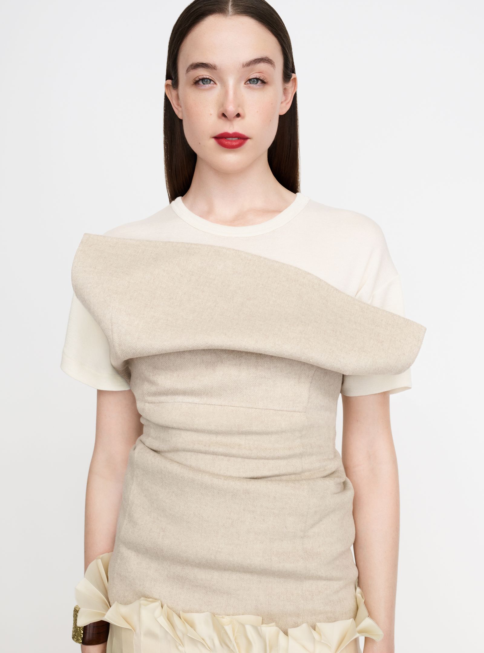 “我们生活在一个一切都在不断变化的时代——我相信女性想要的是她们不需要再三考虑的衣服,”2016 年创立 Khaite 的 Holstein 说道。“我希望保持一种诚实:不稀释,不复杂,而是具有前瞻性和直接性。她找不到比演员艾拉·比蒂更合适的缪斯女神了,她今年主演了纽约备受瞩目的亨利克·易卜生的《幽灵》(在林肯中心纽豪斯剧院)和汉娜·莫斯科维奇的《中产阶级的不当性行为》(在米内塔巷剧院)。她穿着 Khaite 衬衫和紧身胸衣;khaite.com。Ana Khouri 袖口。