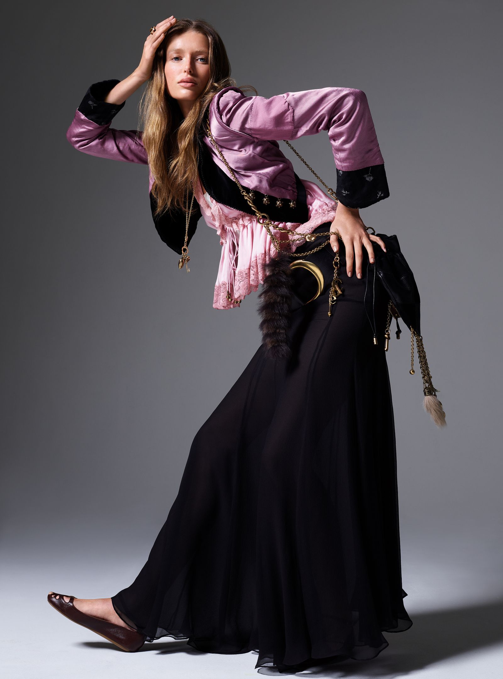 模特 Stella Hanan 将纹理、形状、颜色、态度——所有这一切——由创意总监 Kamali 设计的 Chloé 从头到脚;chloe.com。