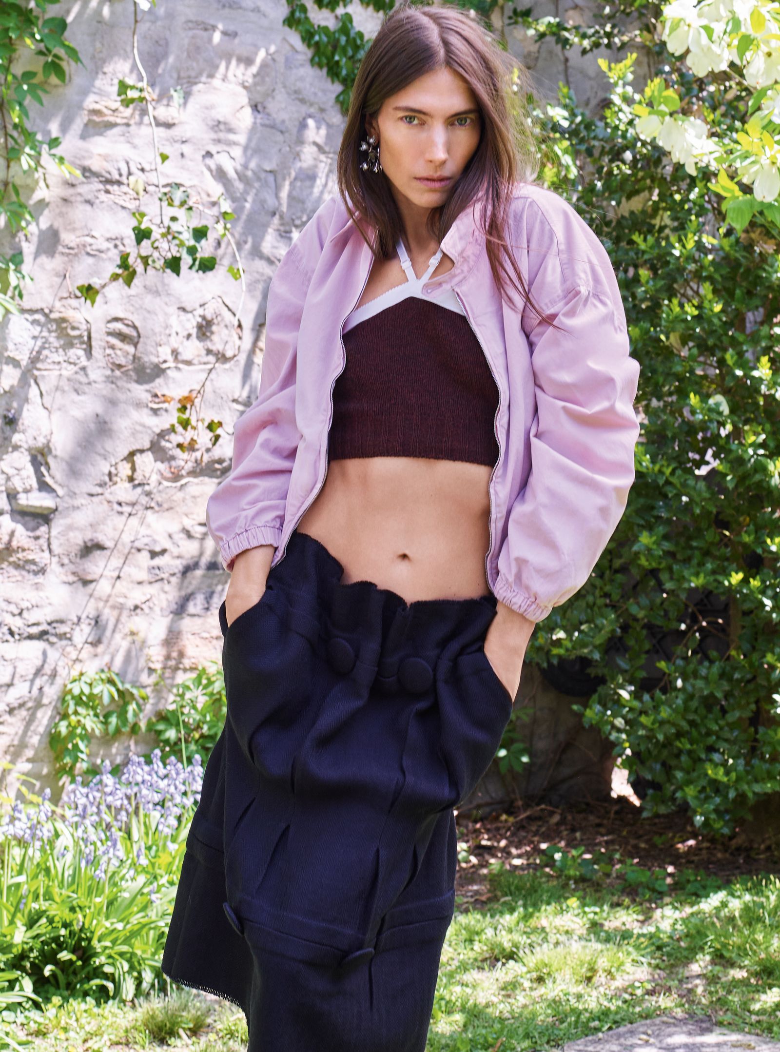 运动、甜美、有点颠覆性:模特杰西卡·米勒 (Jessica Miller) 在她的夹克、露脐上衣和半身裙中体现了 Miuccia Prada 的所有优雅气息,全部由 Prada 设计;prada.com. Simone Rocha 耳环。