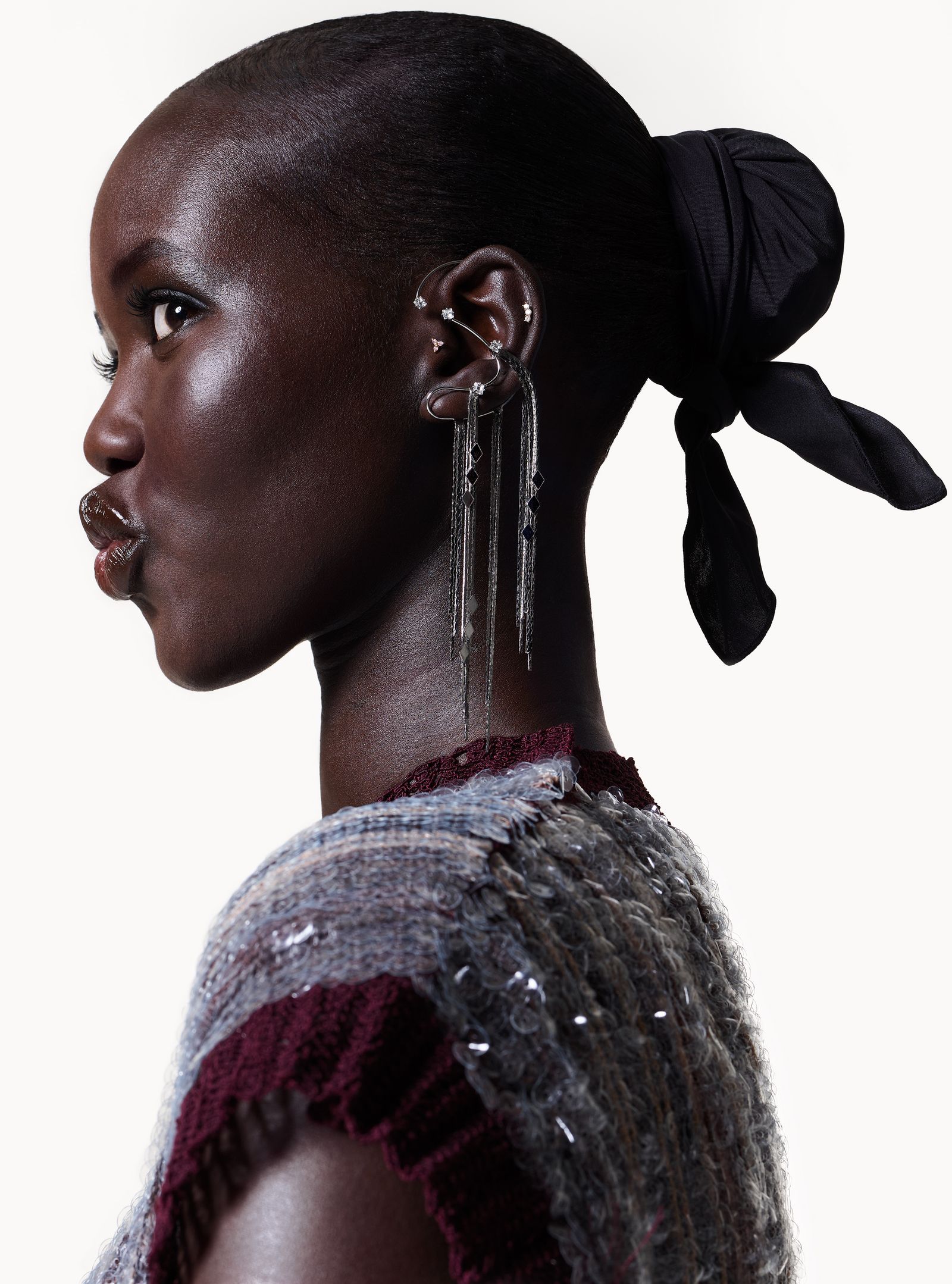 “对于女性设计师来说,现在从未像现在这样重要的时刻,”伯奇说,她的同名品牌今年已经 21 岁了。“他们具有创新性、直觉性,并且从本质上了解身体以及女性想要的感觉:自信、美丽和坚强。”模特 Adut Akech 戴着耳环和 Tory Burch 的连衣裙,兴高采烈地拥抱了垂坠和宽松的双重;toryburch.com。