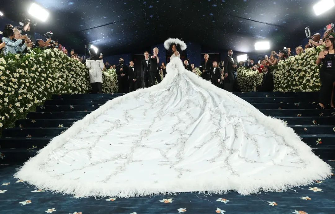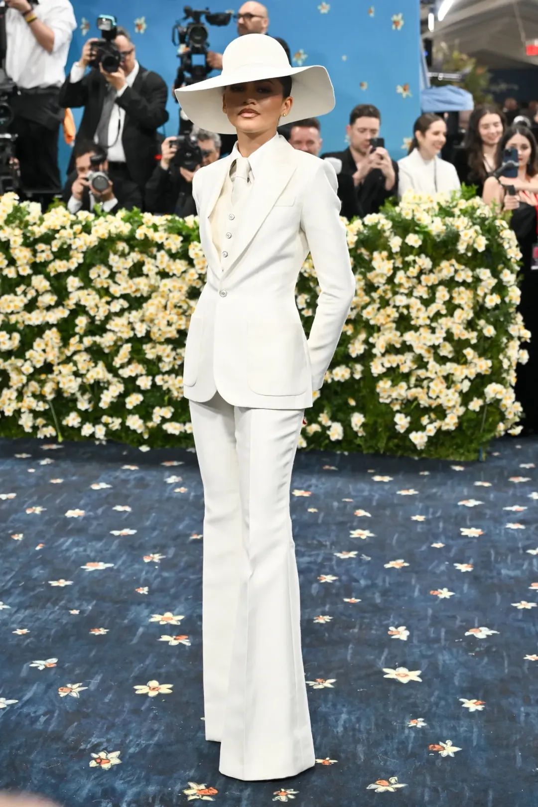 永远不要低估Zendaya在红毯(蓝毯)上制造轰动的能力。她在2025年Met Gala上再次惊艳登场,穿着由Pharrell Williams为Louis Vuitton定制的白色zoot suit,造型由Law Roach构思整套造型散发着Bianca Jagger那套著名Yves Saint Laurent婚礼西装的气场,只不过换成了裤装!