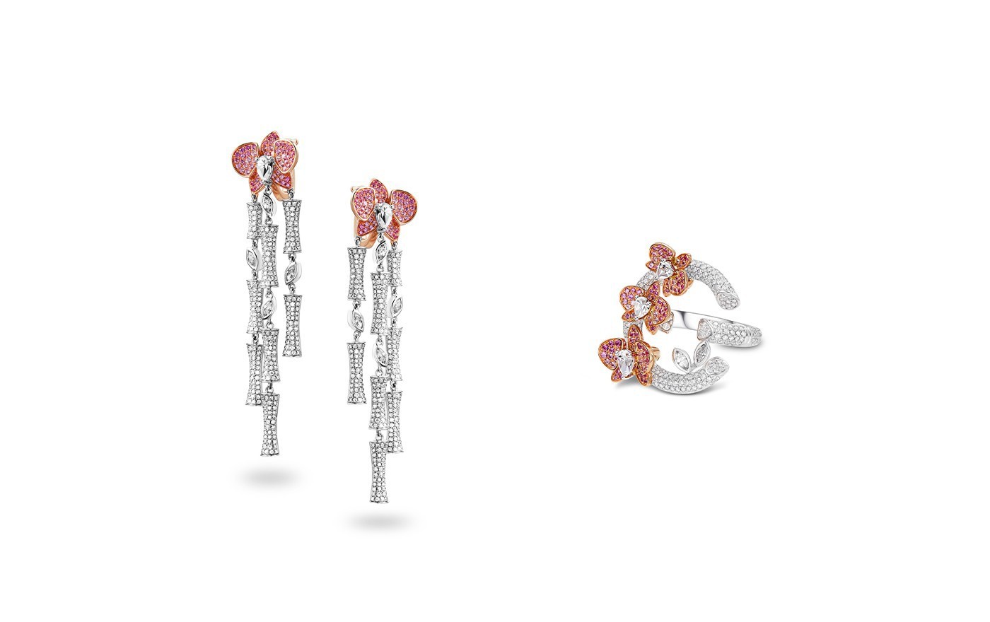 Qeelin 麒麟 Bamboo 高级珠宝系列 18K白金镶嵌钻石与粉红蓝宝石Orchid耳环